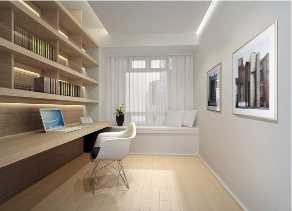 客卧:另外一间客房设计出于综合考虑,有多种功能及用途。在此处,我们设计成书房,摆放一家人最重要最温馨时刻的照片、外出旅游的各种纪念品、喜爱的书籍,来凝聚家庭成员关爱的力量。
