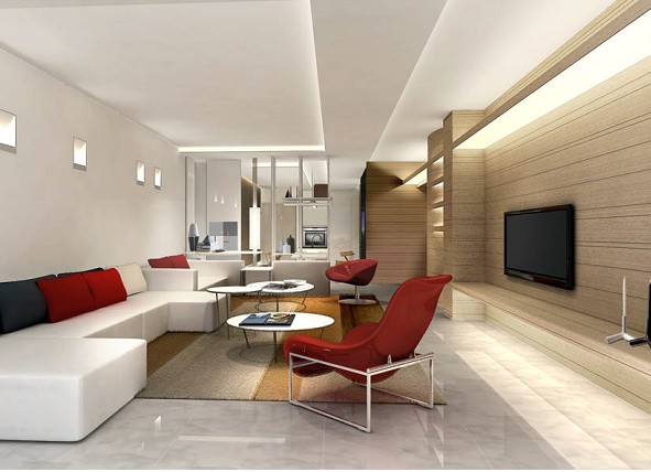“摩登当代”风格,刻意地营造“面对面”的环境:起居室的沙发面对功能墙,和谐、美观、舒适、实用集一体,强调单一清晰的室内形象。
