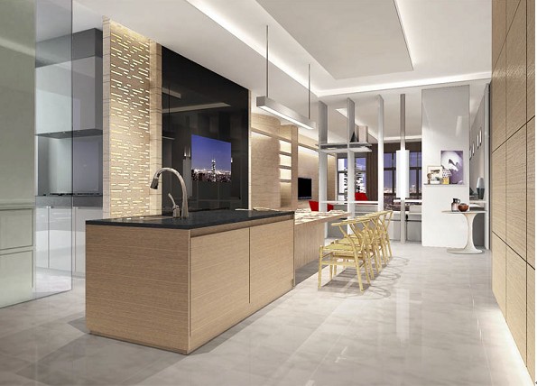 本套设计亮点是将厨房、餐厅和起居室联通,构建敞开式和谐美观的居家空间。