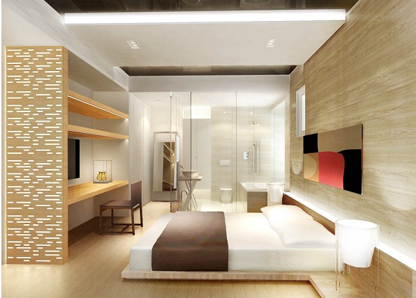 卧室:此套房型的卧室是为一对夫妇准备的“公寓中的公寓”。透明玻璃墙划分盥洗区、厕所和卧房,卧室内兼带一个小小的阅读区,高级漂亮,并非常见的设计。