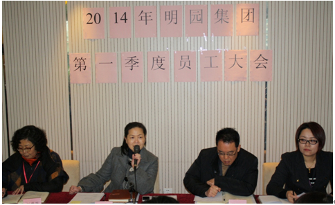 2014年3月6号下午16时,明园集团2014年第一季度全体员工大会在集团总部阶梯会议室召开,明园集团总裁凌菲菲、副总裁林培生、工会主席刘爱萍、集团办公室主任王轶参加会议并主持。