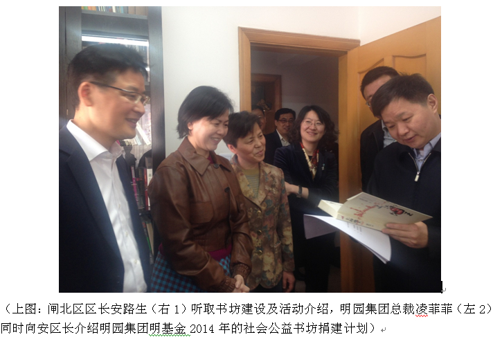 当他听到书坊发起人及捐建者明园集团总裁凌菲菲女士、上海大学文创中心葛红兵教授介绍书坊的“社区讲坛”、“创意工坊”、“幸福心理坊”等活动介绍,又了解到明园集团和上大文创中心在闸北区范围正在捐建另外3 家书坊,并计划在全市再建7家书坊的时候,安区长对校企社区三方共建社区公共活动空间的计划给予了高度评价,指出这种符合现代社区生活需要、满足居民精神需求、因地制宜的社区公益模式应得到广泛重视与推广。