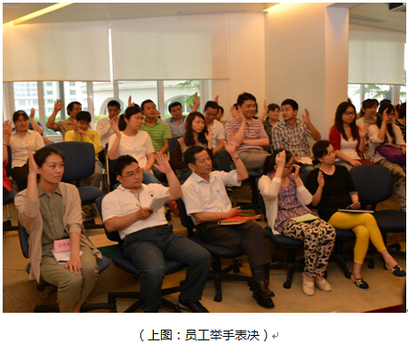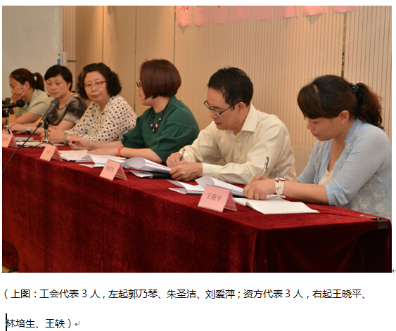 近日,明园集团工会2014年上半年工作情况汇报暨工资集体协商工作会议于集团大会议室顺利召开。明园集团全体职工列席参加。会议由明园集团工会主席刘爱萍主持,工会经委委员朱圣洁、工会委员郭乃琴与会就座。资方出席代表为明园集团副总裁林培生、行政人事部经理王轶、人事王晓平。