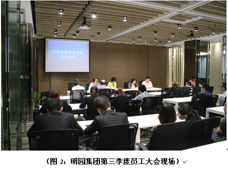 2014年9月19日下午15时,明园集团2014年第三季度全体员工大会在集团总部大会议室内召开,明园集团总裁凌菲菲、工会主席刘爱萍、项目副总邵录兵出席会议并讲话,集团办公室主任王轶主持会议。