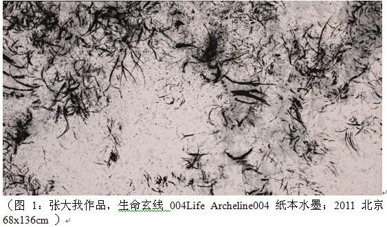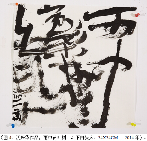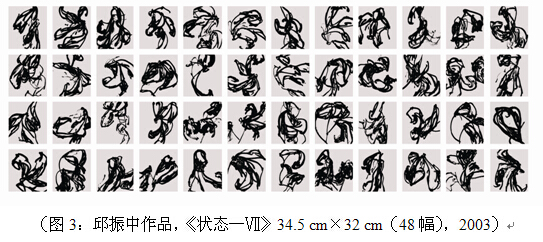 张大我以墨线为基本线索,总体性地转化了传统,使之逃逸出来,他的自然草线,有着自然元素性的拟似,进入了自然节奏的默化共感,极为自由而浩瀚地扩展了墨线柔软而飞舞的默化生长力;王冬龄的书体式书写则不断扩大书法的书写潜能,吸纳现代性的欲望与图像,让文字与图像并置,扩展了书写的表现力;邱振中以草书的日常书写转化传统,试图从书法内部不断突破,通过书写改变我们的感知与生存模式,从而默默地改变世界,把日常书写的默化功效与个体的自由表达结合起来;沃兴华的书法不仅有着深厚的传统修养,而且还有强烈的现代意识,在保留汉字的语义性与笔墨书写性的基础上,利用形式构成的方法强调空间造型和时间节奏,推动了书法艺术从文本向图式、阅读向观看、传统向现代的转化;刘永刚则让文字与线条走向公共空间,让文字成为站立的雕塑,并以其特有的对巴斯巴文以及异域文字的想象“篡改”汉字,与身体姿势结合,形成了以“爱拥”为基本身体姿态伦理的立体雕塑;张浩的作品看似与传统书写性全然没有关系,也非西方的抽象绘画,然而他却让笔墨本身的表现力得到了极大发挥,以毛笔为思维的魂魄,使之在世界宽阔地自由行走,打开了画面的活化空间;陈光武虔心二十多年的创作为水墨书写的两次革命开启了范例,即从革命到默化,以及从默化到革命的逆转,体现了水墨书写最为内在的诉求,其创作对书写有着新的启示性贡献,这是他以“文码”开始的反向重构。